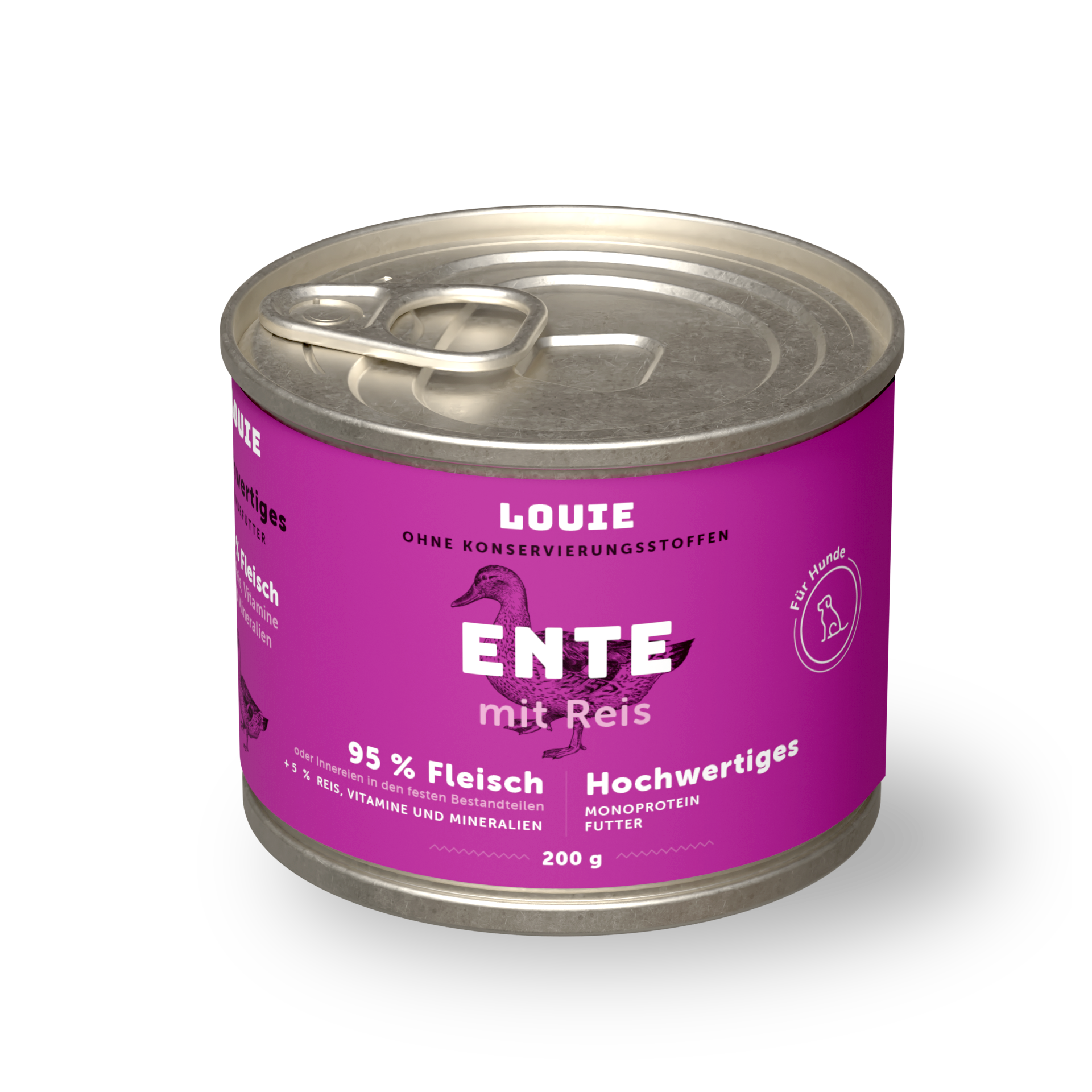 Jeder Hund hat seinen eigenen Geschmack, aber die LOUIE-Dosen werden aus hochwertigen Zutaten hergestellt und haben ein natürliches Aroma und einen Geschmack, dem die meisten Hunde nicht widerstehen können. Und falls deinem Hund die Dose tatsächlich nicht schmecken sollte, musst du dir keine Sorgen machen – wir bieten unsere „Leere-Napf-Garantie“! Das bedeutet: Frisst dein Hund das Futter nicht, erstatten wir dir dein Geld zurück. Mehr Informationen findest du hier. 😊
