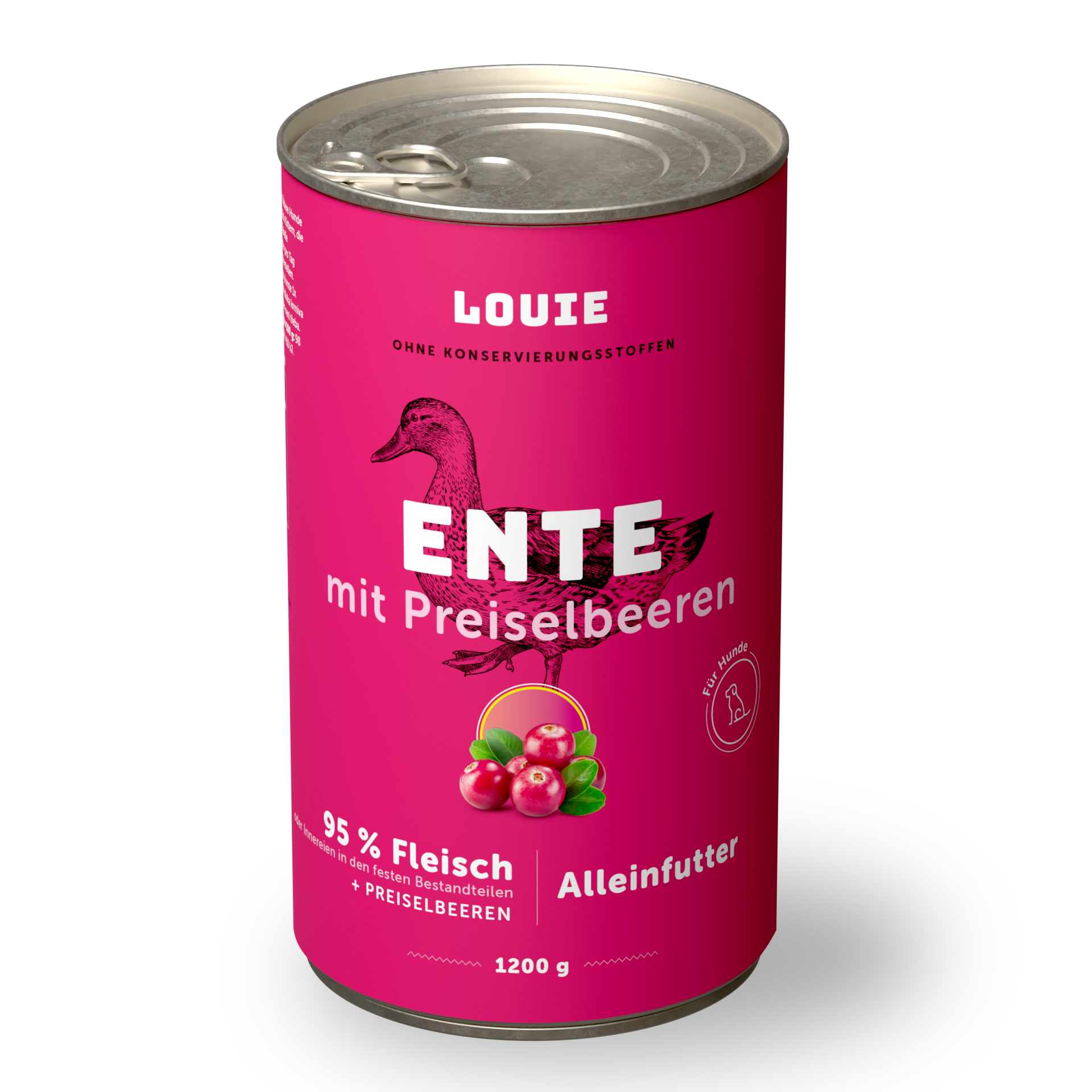 Ein vollwertiges Futter ohne unnötige Zusätze. Die saftige Dose enthält 95 % Entenfleisch im festen Anteil und 5 % pflanzliche Bestandteile, Vitamine und Mineralstoffe. Die enthaltenen Preiselbeeren unterstützen die Gesundheit der Harnwege und fördern die Darmperistaltik. Und nach dem Fressen bleibt von Louie nur ein leer geschleckter Napf übrig.