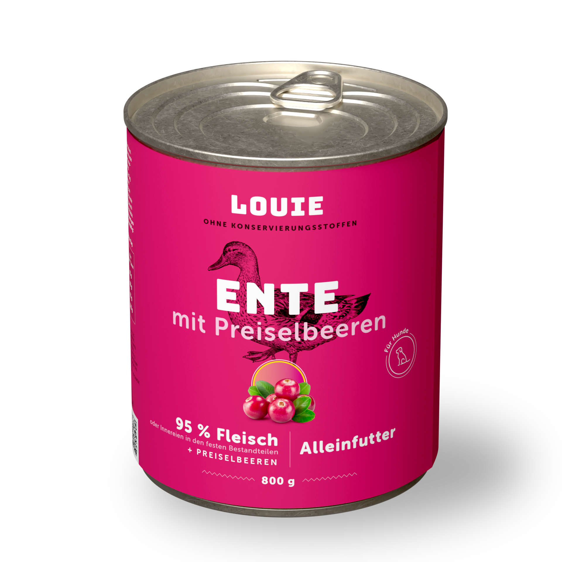 Ein vollwertiges Futter ohne unnötige Zusätze. Die saftige Dose enthält 95 % Entenfleisch im festen Anteil und 5 % pflanzliche Bestandteile, Vitamine und Mineralstoffe. Die enthaltenen Preiselbeeren unterstützen die Gesundheit der Harnwege und fördern die Darmperistaltik. Und nach dem Fressen bleibt von Louie nur ein leer geschleckter Napf übrig.