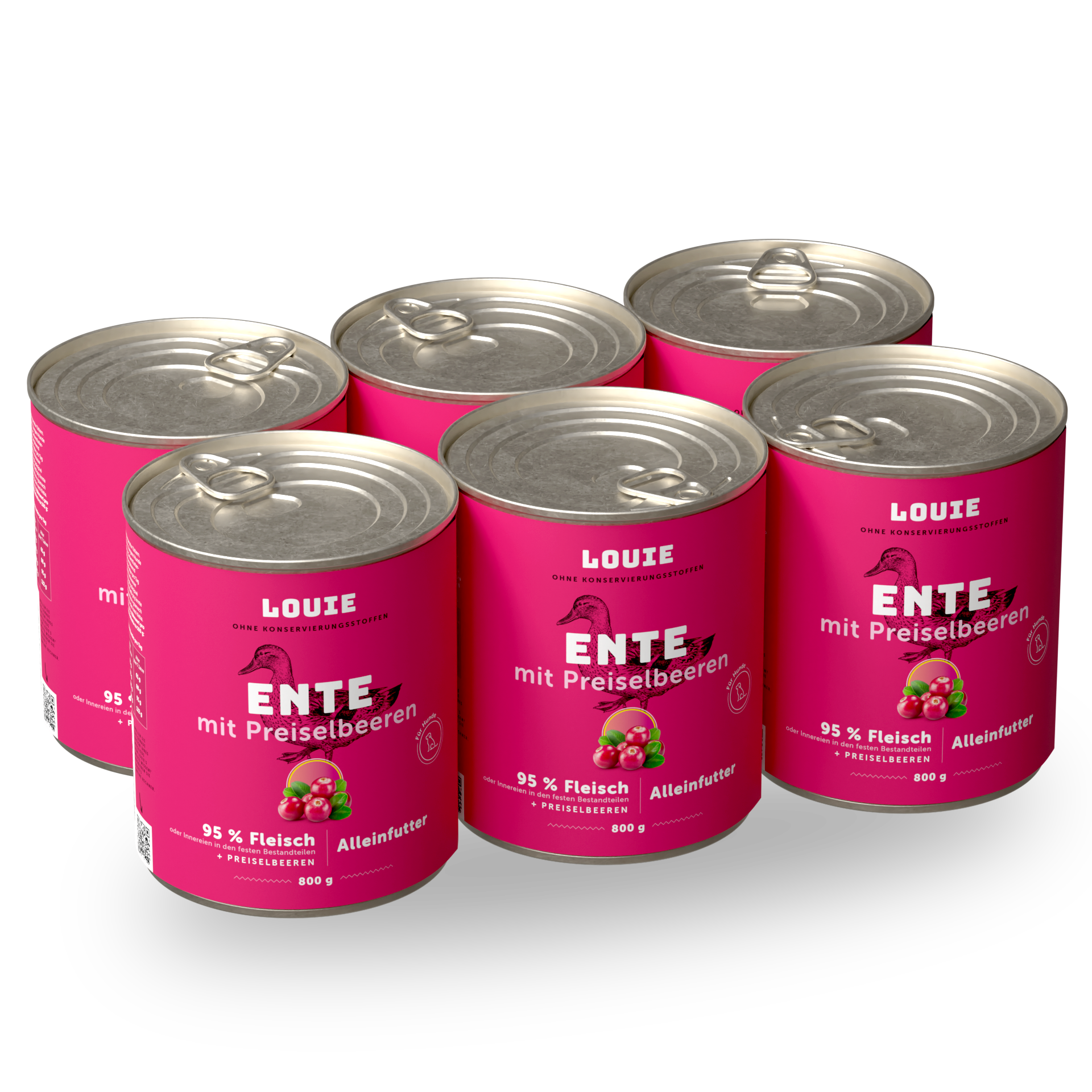 Vollwertiges Futter ohne unnötigen Schnickschnack. Die saftige Dose enthält 95 % Entenfleisch im festen Anteil sowie 5 % pflanzliche Bestandteile, Vitamine und Mineralstoffe. Die enthaltenen Cranberries unterstützen ein gesundes Harnsystem und fördern die Darmperistaltik. Und nach Louie bleibt nur ein sauber ausgeschleckter Napf übrig.