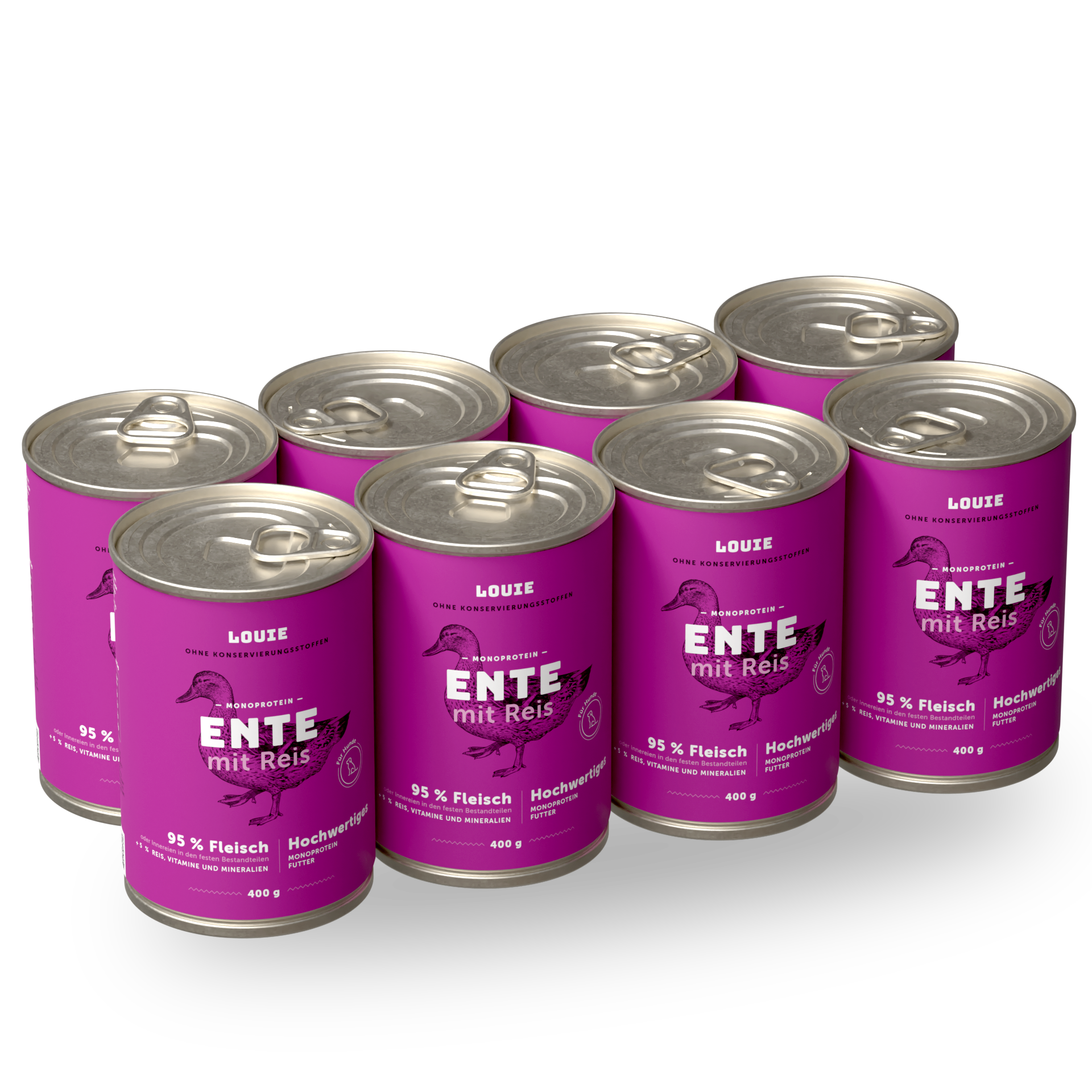 Vollwertiges Futter ohne unnötigen Schnickschnack. Enthält 95 % Entenfleisch im festen Anteil und 5 % pflanzliche Bestandteile, Vitamine und Mineralstoffe. Der zugesetzte Reis liefert dem Hund wichtige Nährstoffe und Mineralien, sodass dein vierbeiniger Freund alles hat, was er für ein gesundes und aktives Leben braucht.